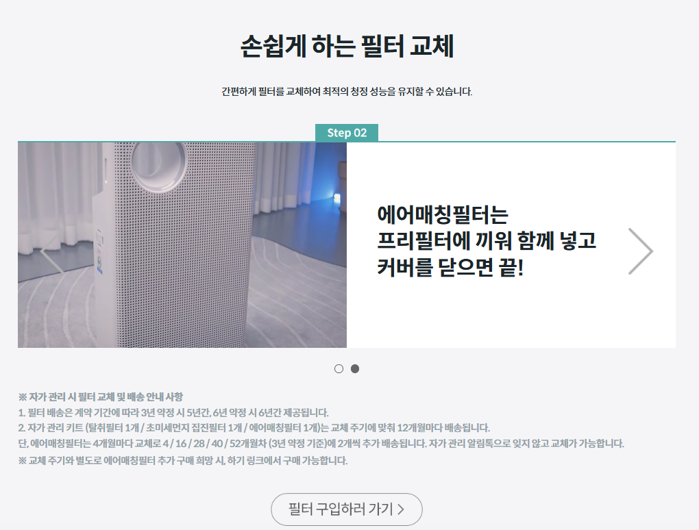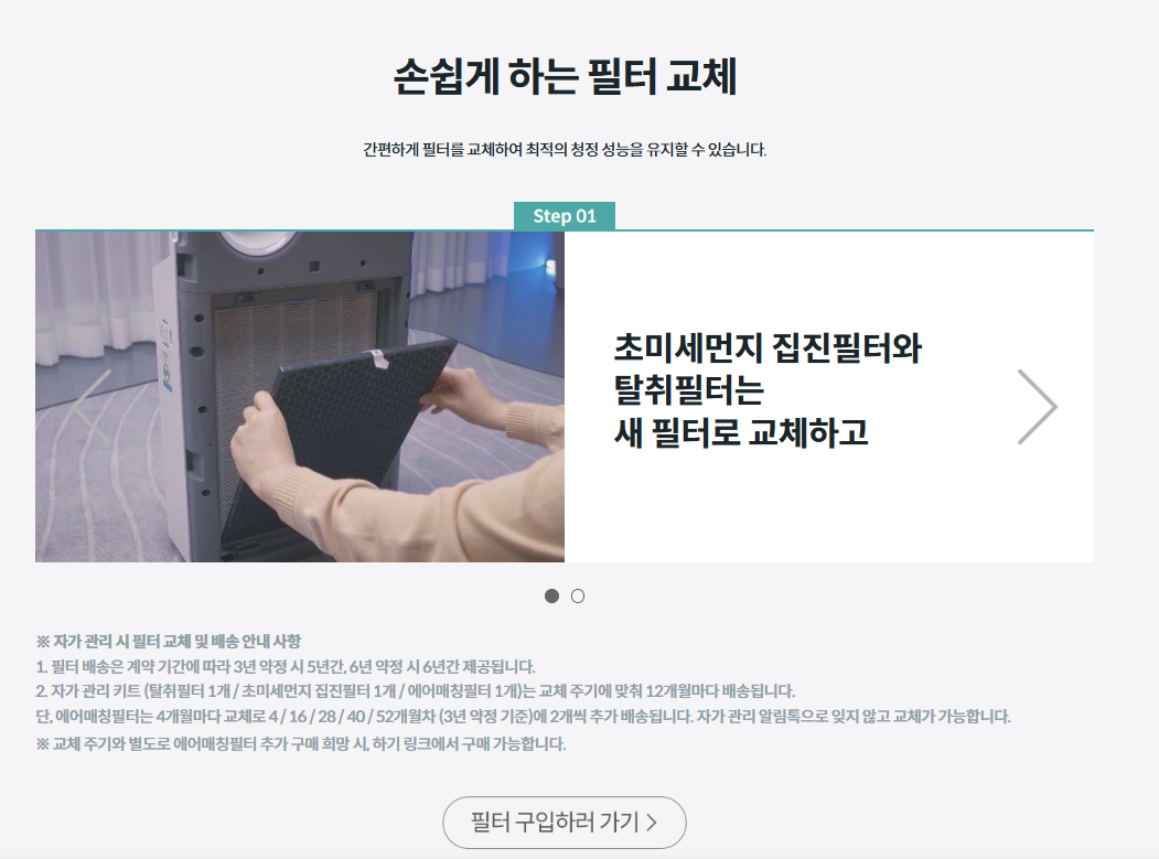 - 사용 환경에 따라 필터 수명이 달라지니, 주기적인 확인이 필요합니다.