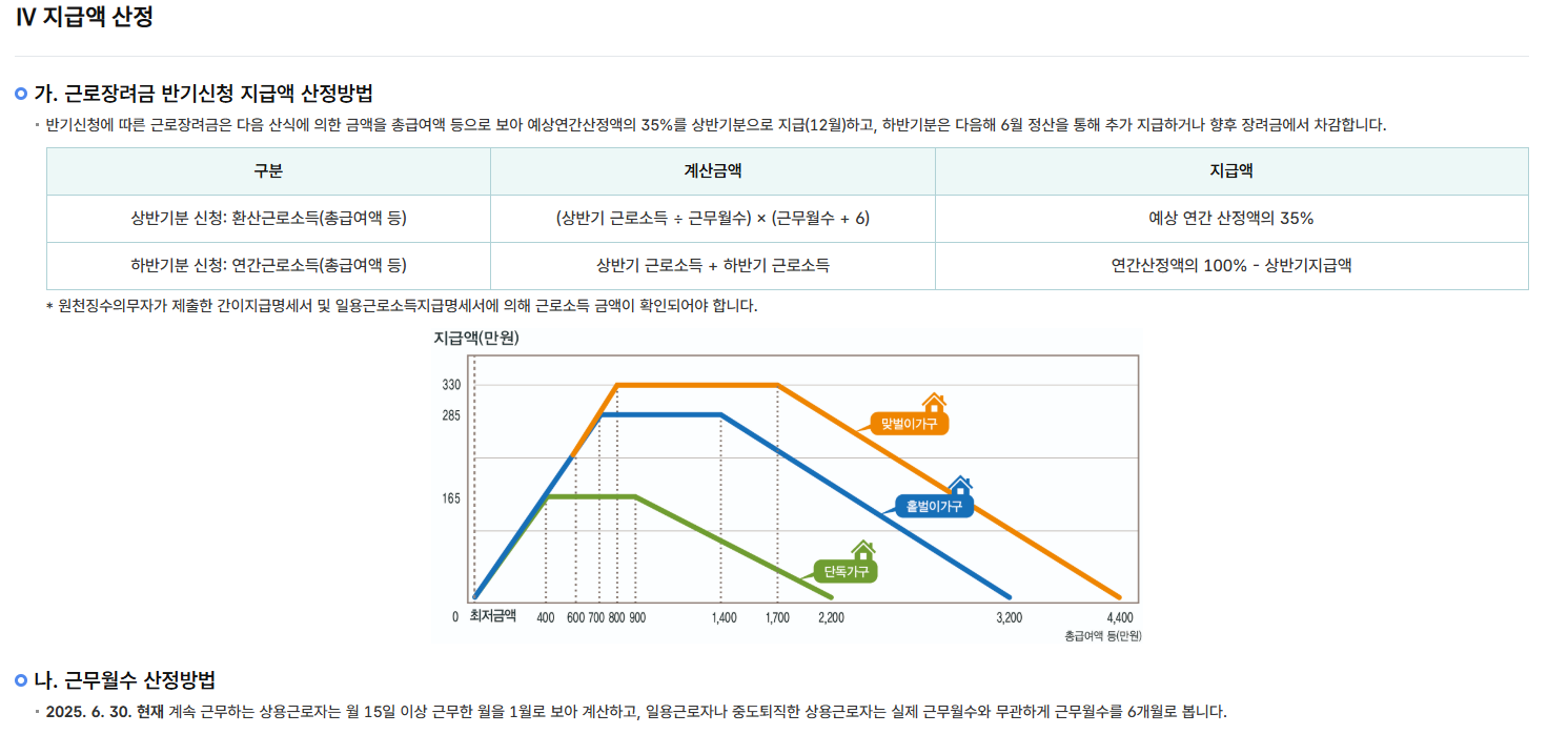 근로장려금은 총소득 수준과 **가구 유형(단독·홑벌이·맞벌이)**에 따라