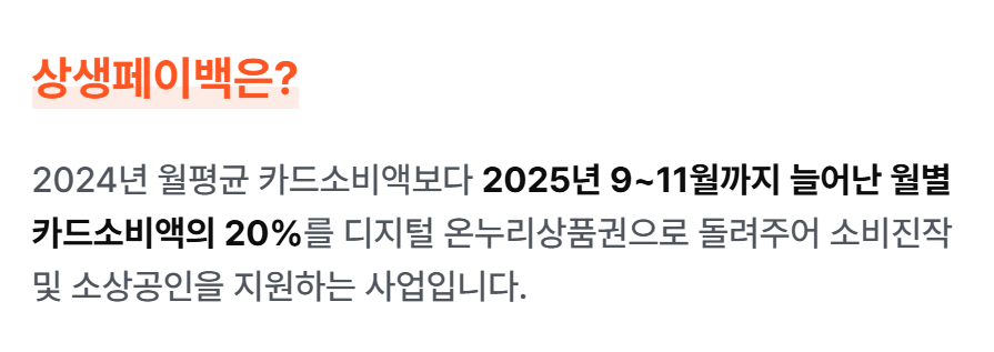 2025년 상생페이백은 2024년 월평균 카드사용액보다 2025년 9~11월까지 소비가 증가하면, 그 증가분의 20%를 디지털 온누리상품권으로 환급해주는 정부 지원사업입니다.