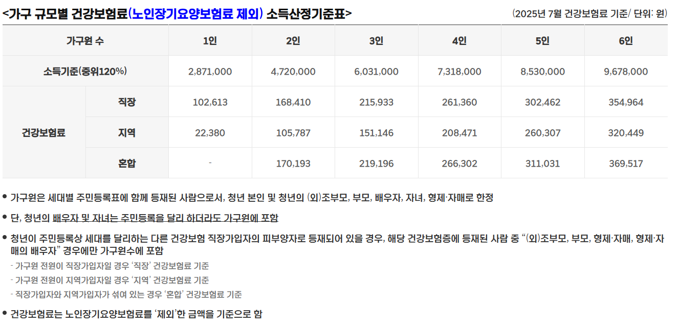 - 소득: 기준 중위소득 120% 이하 (2025년 기준 가구별 건강보험료 기준 적용)