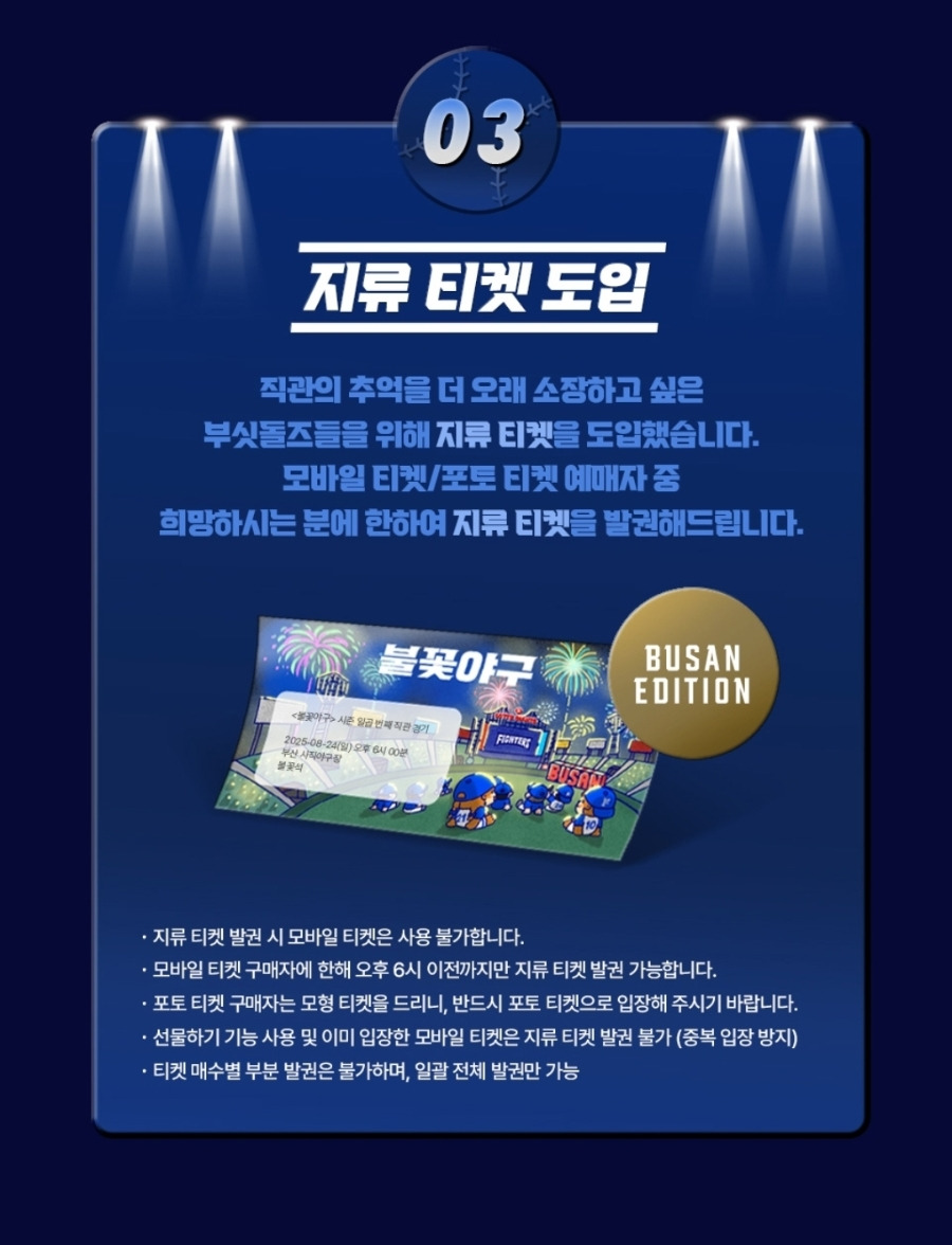 • 지류 티켓은 현장 발권 (1루, 3루, 외야 매표소)