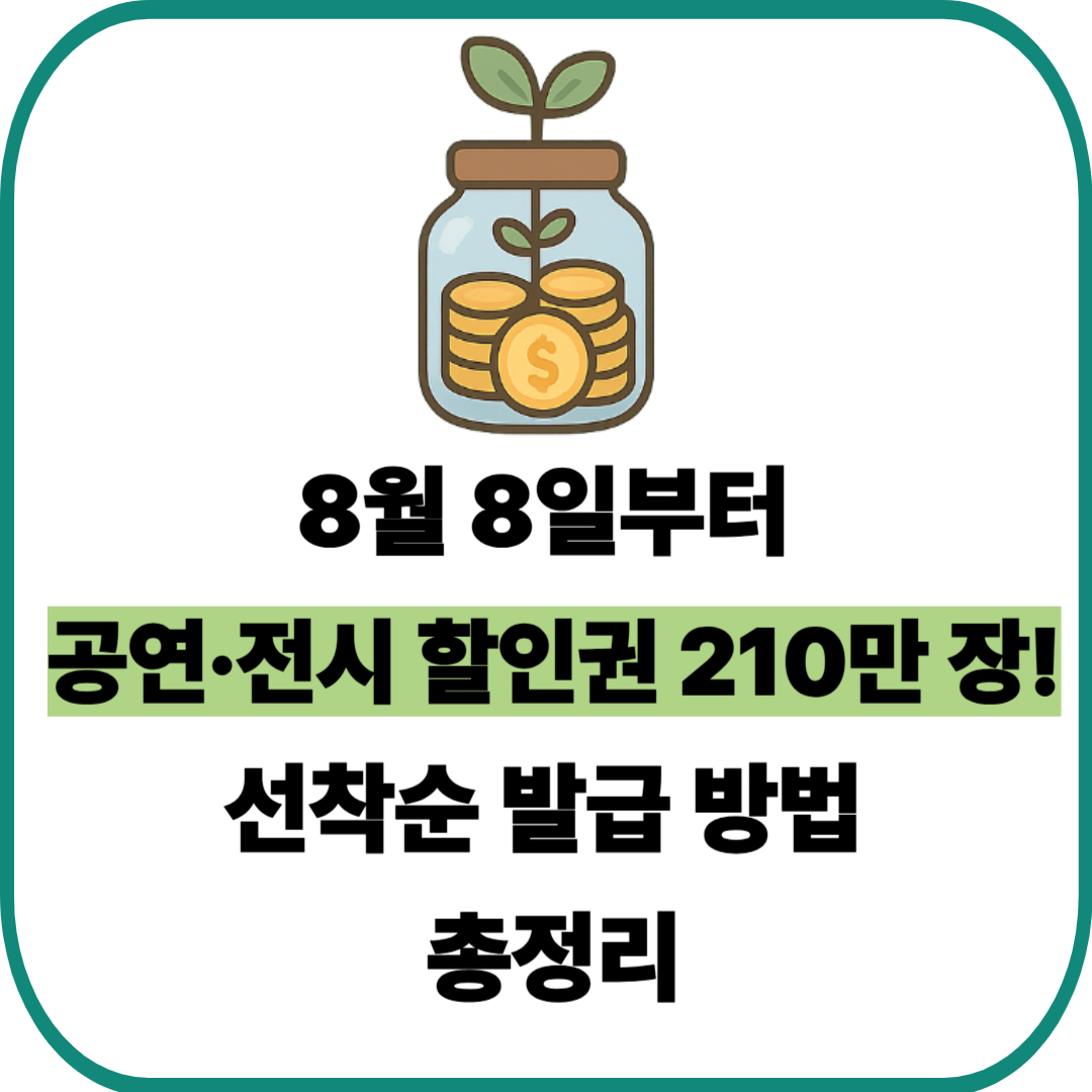 2025년 8월 8일부터 공연·전시 할인권 210만 장이 선착순으로 배포됩니다. 공연은 1만 원, 전시는 3,000원씩 할인받을 수 있으며, 전국 주요 예매처에서 간편하게 신청할 수 있습니다.